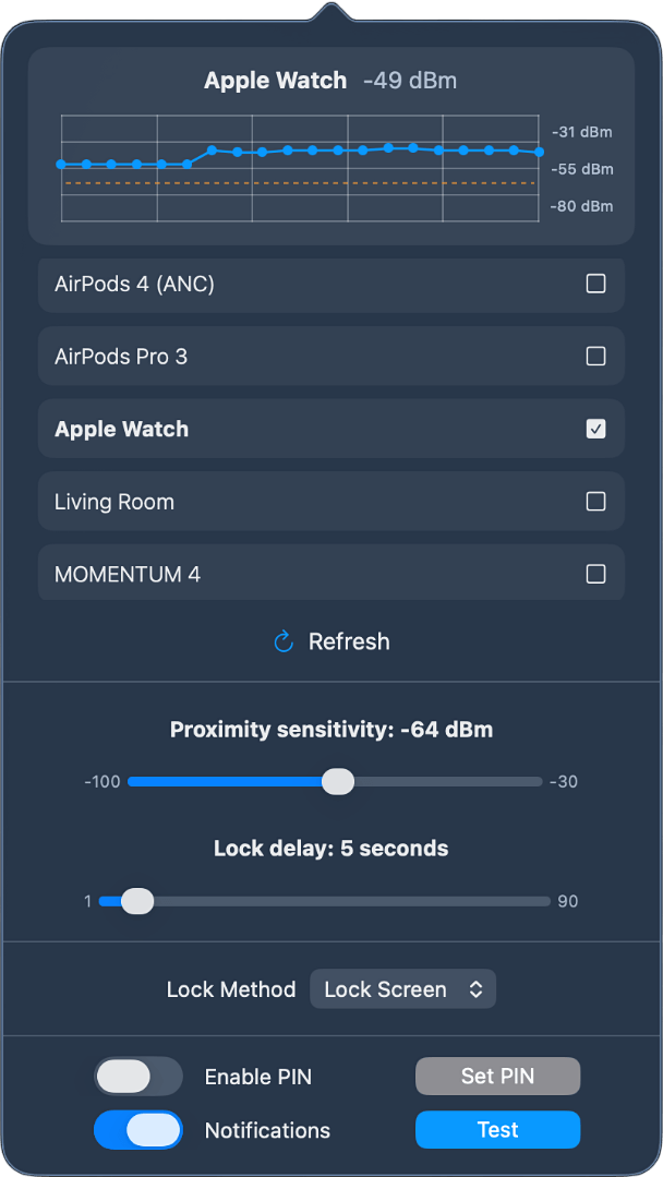 ProximityLock uses Bluetooth Low Energy (BLE) to monitor the signal between your Mac and your selected Apple device. When you move beyond a certain range, it automatically locks your Mac.